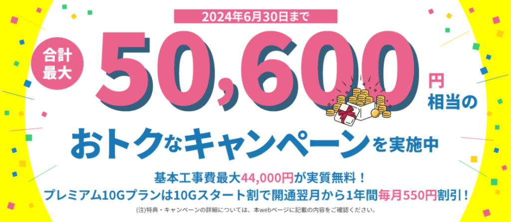 プレミアム10G 基本工事費最大50,600円が実質無料!概要