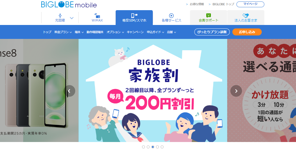BIGLOBEモバイルの評判や口コミは?料金や速度・メリットやデメリット・おすすめの人を解説! 2026 3/12 PR 格安スマホ 2026年3月12日 PR ホームルーターとポケット型WiFiを14日間550円でお試し!ホームルーターとポケット型WiFiが2つ同時に14日間550円で試せちゃう!4月は16セット限定(残り5セット)14日間550円「ゴールデンウィークの旅行先で!」「ご実家の帰省の際に少し」って思っている方必見!なんと550円でWiMAXのポケット型WiFiとホームルーターを14日間だけ両方同時に「お試しレンタル」できちゃう!もちろん気に入れば、そのまま契約しなおしでもOK!4月16セット限定!早い者勝ちです。詳細はこちら申込みはこちら ※本記事の料金表示は全て税込みです(一部キャッシュバックなど不課税のものもあります)。 BIGLOBEモバイル(ビッグローブモバイル)はスマホ料金を節約したいユーザーや格安SIMに興味があるユーザーにとって非常に魅力的な選択肢です。 この記事ではBIGLOBEモバイルの評判や口コミを徹底的に解説します。良い評判・悪い評判を紹介し、BIGLOBEモバイルの基本情報からメリット・デメリットまでを詳しく説明します。 \ エンタメフリーオプションを組み合わせれば /対象21サービスが通信料ノーカウント! BIGLOBEモバイル公式サイトはこちら 目次BIGLOBEモバイルの基本情報 BIGLOBEモバイルは、多くのユーザーに支持されている格安SIMの一つです。 特に、YouTubeや音楽ストリーミングサービスをよく利用する方にとっては、エンタメフリー・オプションが魅力的です。また、手頃な料金プランや幅広い対応端末も、多くの人々にとって選びやすいポイントとなっています。 この記事では、BIGLOBEモバイルの使用回線や料金プラン、対応端末について詳しく解説していきますので、これから格安SIMを検討される方にとって役立つ情報をお届けします。 BIGLOBEモバイルの基本情報使用回線ドコモ回線、au回線月額料金データ+通話コースの基本料金1GB:1,078円3GB:1,320円6GB:1,870円12GB:3,740円20GB:5,720円30GB:8,195円※BIGLOBE家族割やビッグローブ光利用で毎月220円割引対応端末iPhone・Android端末 使用回線 BIGLOBEモバイルは、ドコモ回線、au回線の2つのキャリア回線を利用することで、広範囲で安定した通信を提供しています。 特に、都市部だけでなく地方でも強い電波が届くため、多くのユーザーにとって信頼できる選択肢となっています。 回線を選ぶ際には、自分の生活圏でどのキャリアが最も強いかを確認し、それに基づいて最適な回線を選択することが推奨されます。 料金プラン BIGLOBEモバイルの料金プランは非常にシンプルで、ユーザーの使用状況に合わせて選べるようになっています。 例えば、データ通信を中心に利用する方にはデータプランが、音声通話も必要な方には音声通話SIMプランが用意されています。プランの一例として、1GBから30GBまでの幅広いデータ容量が選択可能で、料金は1,078円から8,195円となっています。 また、家族割やビッグローブ光とのセット割引を利用することで、さらにお得に契約できる点も魅力です。 BIGLOBEモバイルの料金プランの詳細は公式サイトよりご確認をお願いします。 対応端末 BIGLOBEモバイルは、iPhoneやAndroid端末を含む多くのスマートフォンに対応しています。 対応端末は、ドコモやauで購入した端末のほか、SIMフリーの端末も利用可能です。また、動作確認済み端末リストが公式サイトに掲載されており、これにより自分の端末がBIGLOBEモバイルで使用できるかどうかを事前に確認することができます。 新たに端末を購入する場合も、BIGLOBEモバイルでは最新のiPhoneや人気のAndroid端末をお得な価格で提供しています。 BIGLOBEモバイルの対応端末 \ エンタメフリーオプションを組み合わせれば /対象21サービスが通信料ノーカウント! BIGLOBEモバイル公式サイトはこちら BIGLOBEモバイルのメリット ここではBIGLOBEモバイルの代表的なメリットについて詳しく解説します。 【BIGLOBEモバイルのメリット】 YouTubeなどサブスクとのセット利用が可能 「通信速度が速い」という口コミがある 料金が比較的安い 大容量プランがある プランが豊富にある YouTubeなどサブスクとのセット利用が可能 BIGLOBEモバイルの最大の特徴の一つは、YouTubeやSpotifyなどのサブスクリプションサービスをデータ容量を気にせずに利用できる「エンタメフリー・オプション」です。 月額わずか308円で、21種類の対象サービスの通信料がノーカウントになるため、特に動画視聴や音楽ストリーミングを頻繁に利用するユーザーにとっては大きなメリットとなります。 このオプションを活用することで、1GBや3GBといった低容量プランでも十分なパフォーマンスが得られます。 「通信速度が速い」という口コミがある BIGLOBEモバイルは、ドコモ、auの大手キャリア回線を利用しているため、通信速度に関しても高い評価を受けています。 特に、都市部や主要エリアでは、安定した高速通信が可能で、日常的なインターネットの利用はもちろん、動画視聴やオンライン