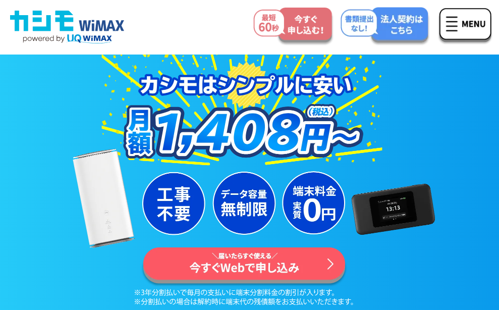 ソフトバンクエアーが繋がらない・遅い原因と対処法|改善しない場合の乗り換え先も紹介 2026 4/20 PR Wi-Fi WiMAX ホームルーター 2026年4月20日 PR ホームルーターとポケット型WiFiを14日間550円でお試し!ホームルーターとポケット型WiFiが2つ同時に14日間550円で試せちゃう!4月は16セット限定(残り5セット)14日間550円「ゴールデンウィークの旅行先で!」「ご実家の帰省の際に少し」って思っている方必見!なんと550円でWiMAXのポケット型WiFiとホームルーターを14日間だけ両方同時に「お試しレンタル」できちゃう!もちろん気に入れば、そのまま契約しなおしでもOK!4月16セット限定!早い者勝ちです。詳細はこちら申込みはこちら ソフトバンクエアー(SoftBank Air)を使っていて、「急に繋がらなくなった」「夜になると遅くて使い物にならない」と悩んでいませんか? 原因はさまざまですが、ランプの状態を確認したり、設置場所を見直したりするだけで改善するケースも多くあります。この記事では、繋がらない・遅い原因をランプ別に解説し、自分でできる対処法を9つ紹介します。 対処法を試しても改善しない場合は、回線自体を変えることが根本解決への近道です。乗り換え先としてBroad WiMAXをはじめとするおすすめホームルーター4社も比較して紹介するので、乗り換えを検討している方もぜひ参考にしてください。 目次【結論】対処法を試しても改善しない場合はBroad WiMAXへの乗り換えがおすすめ 参照元:Broad WiMAX Broad WiMAXのおすすめポイント 初月0円~、実質月額3,568円と安い キャンペーンが豊富 37,000円キャッシュバック&事務手数料無料になるのはWiFiストアだけ au、UQ mobileのスマホとセット割が使える 対処法をひととおり試しても繋がらない・遅いが改善しない場合、原因はソフトバンクエアーの回線そのものにある可能性が高く、設定や端末を見直しても解決しません。 そのような場合は、回線ごと乗り換えることが根本的な解決策です。 乗り換え先として特におすすめなのが「Broad WiMAX」です。au・WiMAX回線を使用しており、ソフトバンクエアーとは別の回線に切り替えられます。 Broad WiMAXは、初月0円、実質月額は3,328円と安い料金でWiMAXが利用できます。他社からの乗り換え時の違約金を最大40,000円還元するキャンペーンも実施中のため、ソフトバンクエアーの端末残債が残っている方でも乗り換えやすいのが特徴です。 キャンペーンも充実していて、以下のボタンから契約すると、47,000円のキャッシュバックに加えて3,300円の事務手数料も無料!この2つの特典が同時に受けられるのは、WiFiストアだけです。ぜひ活用してみてください。 \ WiFiストア限定 /47,000円キャッシュバック&事務手数料3,300円無料! Broad WiMAX公式サイトはこちら ソフトバンクエアーが繋がらない・遅くなる原因 ソフトバンクエアーが繋がらない・遅いと感じる原因は、大きく5つに分けられます。まずは原因を把握することで、自分に合った対処法が見つかりやすくなります。 原因①エリア・時間帯の問題 ソフトバンクエアーは、Airターミナルがソフトバンクの基地局と無線で通信することでインターネットに接続します。そのため、以下の状況では繋がらない・速度が遅くなることがあります。 基地局から距離が遠い、または周囲に建物や地形などの障害物がある 朝の通勤時間帯・昼食時間帯・夜間(プライムタイム)など利用者が集中する時間帯で回線が混雑している 対応エリアかどうかはソフトバンク公式サイトの「住所別下り最大通信速度情報」から住所を入力して確認できます。 エリア内でも基地局から遠い場合や鉄筋コンクリートのマンションでは電波が弱まりやすく、通信が不安定になることがあります。 なお、Airターミナル4NEXT以前の旧端末を使用している場合は、夜間に速度が著しく低下しやすい傾向があります。現在の最新端末はAirターミナル6(Wi-Fi 7対応)で、5G対応により夜間でも安定しやすくなっています。端末バージョンはAirターミナル本体の底面シールで確認できます。 原因②Airターミナルの設置場所が悪い Airターミナルの設置場所は、通信速度や安定性に大きく影響します。電波はコンクリートや鉄には遮断されやすく、ガラスはほぼ透過するため、窓から離れた部屋の奥や棚の中などに設置していると電波を十分に受信できません。 また、電子レンジ・Bluetooth機器はWi-Fiと同じ2.4GHz帯の電波を使用するため、近くに置くと干渉して通信が不安定になることがあります。 現在の電波受信状況は、本体の「LEVEL」ボタンを長押しすることで確認できます。上部3つのランプのうち青が1つだけ点灯している場合は電波が弱い状態、赤が1つ点灯している場合はインターネットに繋がっていない状態を示します。 原因③機器の不具合・故障 Airターミナル本体に不具合や故障がある場合も、繋がらない・速度が低下する原因になります。長時間の連続使用による過熱、落下による内部破損などで動作が不安定になることがあります。 本体側面のランプで