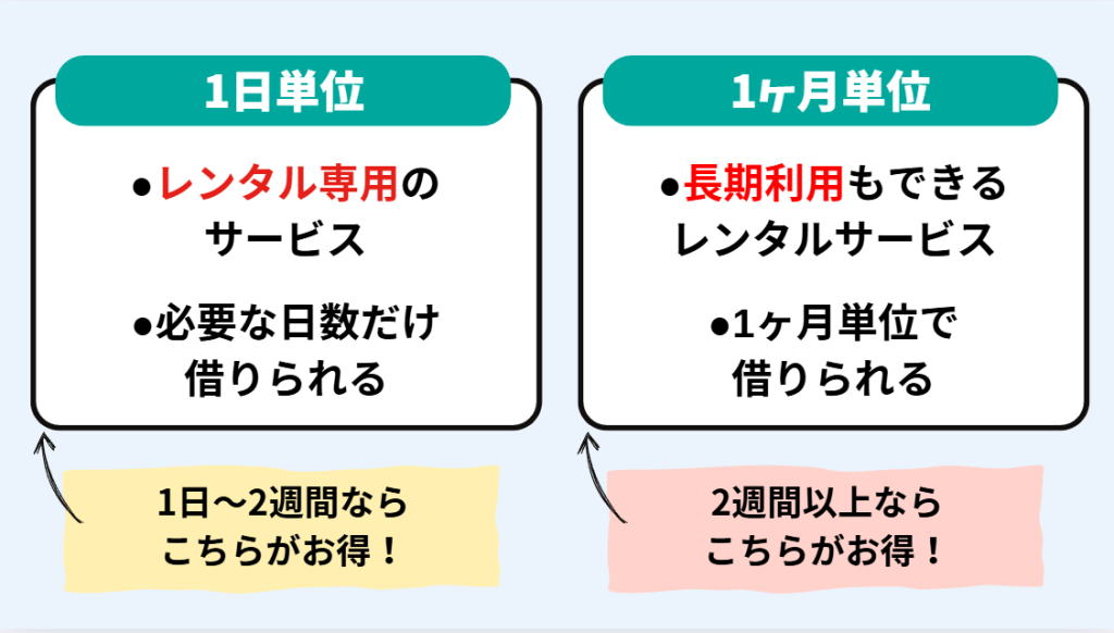 ポケット型Wi-Fiレンタルおすすめ比較|短期〜1ヶ月でお得に使えるサービス 2026 4/21 PR Wi-Fi ポケット型WiFi レンタル 2026年4月21日 PR ホームルーターとポケット型WiFiを14日間550円でお試し!ホームルーターとポケット型WiFiが2つ同時に14日間550円で試せちゃう!4月は16セット限定(残り5セット)14日間550円「ゴールデンウィークの旅行先で!」「ご実家の帰省の際に少し」って思っている方必見!なんと550円でWiMAXのポケット型WiFiとホームルーターを14日間だけ両方同時に「お試しレンタル」できちゃう!もちろん気に入れば、そのまま契約しなおしでもOK!4月16セット限定!早い者勝ちです。詳細はこちら申込みはこちら 当ページのリンクには広告が含まれています。※本記事の料金表示は基本的に全て税込みです(一部キャッシュバックなど不課税のものもあります)。 急な出張や旅行、帰省、入院などで、短期間だけインターネットを使いたいと困ったことはありませんか? そんなときに便利なのが、工事不要で最短即日で利用可能なポケット型Wi‑Fiのレンタルサービスです。 そこで本記事では、ポケット型Wi‑Fiのレンタルのお得な選び方から、メリット・デメリットをわかりやすく解説。 さらに人気の9社を徹底比較して、レンタルポケット型WiFiのおすすめ厳選5社を紹介します。 1日単位からレンタルできるので、今すぐ借りたい方も、ぜひ参考にしてみてください。 \ 1分まとめ / この記事でわかること レンタルポケット型Wi-Fi選びのポイントは期間・用途・料金 1日から2週間程度レンタルするなら1日単位のレンタルポケット型Wi-Fiがおすすめ→1日単位でレンタルできるサービスを確認する 2週間以上レンタルするなら1ヶ月単位のレンタルポケット型Wi-Fiがおすすめ→1か月単位でレンタルできるサービスを確認する お試し利用ならポケット型Wi-Fiが無料レンタルできるサービスがおすすめ→お試しレンタルできるサービスを確認する 目次ポケット型Wi-Fiのレンタルは1日単位と1ヶ月単位がある 短期レンタルできるポケット型Wi-Fiは大きく分けて、「1日からレンタルできるサービス」と「1ヶ月からレンタルできるサービス」があります。 ポケット型Wi-Fiをよりお得にレンタルするため、それぞれの特徴と違いを押さえておきましょう。 1日~2週間なら1日単位のレンタルのポケット型Wi-Fiがおすすめ 1日からレンタルできるポケット型Wi-Fiの特徴 レンタルを主とするサービスが提供している 必要な日数だけ無駄なくレンタルできる 数日~1週間程度のごく短期間のレンタルに適している 1日~2週間程度の短期間だけポケット型Wi-Fiをレンタルしたいときは、レンタルを専門に扱い、1日単位で借りられる、いわゆる「レンタルサービス」がおすすめです。 必要な日数だけ無駄なく利用でき、当日受け取りできるサービスもあります。旅行や急な出張、入院などで「数日だけポケット型Wi-Fiを借りたい」といった場合に重宝します。 2週間以上なら1ヶ月単位のレンタルのポケット型Wi-Fiがおすすめ 1ヶ月からレンタルできるポケット型Wi-Fiの特徴 長期利用を主とするサービスが提供している 1ヶ月単位でレンタルする 10日~15日以上のレンタルなら1日単位のレンタルより割安 2週間以上のレンタルであれば、長期利用を主とするサービスの端末をレンタルできるプランがおすすめです。 長期利用を主とするサービスが短期間の利用に適さないのは、初期費用(端末の購入代+事務手数料)と短期解約時の違約金により費用がかさむためです。その点、端末がレンタルでき、契約期間の縛りがないサービスならその負担はありません。 最短でも1ヶ月分のレンタル料はかかりますが、レンタル期間によっては1日単位のレンタルサービスより割安な点が魅力。1ヶ月以上の長期レンタルはもちろん、2週間程度のレンタルならこちらの方が安くなる場合が多くあります。 帰省時や長期出張、光回線が開通するまでのつなぎなどで、2週間以上借りるならこちらがおすすめです。 【番外】お試し利用なら無料レンタルがおすすめ ポケット型WiFiの使い勝手を知りたいなど、お試し利用が目的の場合は、無料でお試しレンタルできるサービスがおすすめです。 例えばUQ WiMAXは、送料や事務手数料も一切かからず、無料で15日利用可能な「TryWiMAX」を提供しています。15日間利用できるので、学校や職場をはじめ、さまざまな場所で試すことができます。 Try WiMAXの概要 利用回線※1WiMAX、au機種名Speed Wi-Fi HOME 5G L11/13月間データ容量月間データ容量 制限なし※2最長レンタル期間15日間送料0円最短発送日14時30分までの申し込みで最短当日発送受取方法指定住所に配送(時間帯指定可能)返却方法同封されている着払い伝票にて返送レンタル料金無料 ※1 5Gの提供エリアは一部となります。またプラスエリアモード(一部のLTE回線)を利用する場合は別途料金がかかります。※2 スタンダードモードの場合。一定期間内に大量のデータ通信のご利用があった場合、混雑する時間帯の通信速度を制限する場合