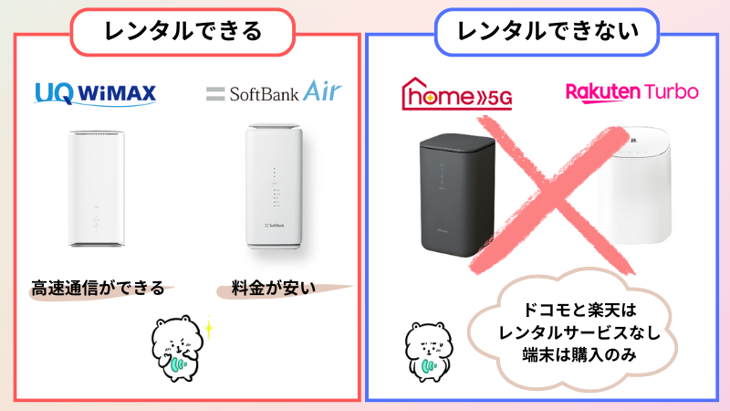 短期・1ヶ月でレンタルできるおすすめホームルーター6選!無料お試しも紹介 2026 4/24 PR Wi-Fi ホームルーター レンタル 2026年4月24日 PR ホームルーターとポケット型WiFiを14日間550円でお試し!ホームルーターとポケット型WiFiが2つ同時に14日間550円で試せちゃう!4月は16セット限定(残り5セット)14日間550円「ゴールデンウィークの旅行先で!」「ご実家の帰省の際に少し」って思っている方必見!なんと550円でWiMAXのポケット型WiFiとホームルーターを14日間だけ両方同時に「お試しレンタル」できちゃう!もちろん気に入れば、そのまま契約しなおしでもOK!4月16セット限定!早い者勝ちです。詳細はこちら申込みはこちら 当ページのリンクには広告が含まれています。※本記事の料金表示は基本的に全て税込みです(一部キャッシュバックなど不課税のものもあります)。 ホームルーターは、コンセントに挿すだけでインターネットが使える自宅用のWi-Fiルーターです。開通工事不要で手軽に利用できるのが魅力です。 ホームルーターは、1日、1ヶ月などの単位でレンタルできるサービスもあり、出張や帰省、引っ越し時のつなぎなどの短期間利用では、端末を購入するよりお得です。 この記事では、安さや通信速度を比較して、おすすめのレンタルホームルーターを紹介します。ホームルーターを短期レンタルしたい人は、ぜひご覧ください。 \ 1分まとめ / この記事でわかること レンタルホームルーターの選び方は期間・月額料金・機種 1日から1週間程度なら1日単位のレンタルホームルーターがおすすめ→1日単位でレンタルできるサービスを確認する 2週間以上レンタルしたいなら1か月単位の縛りなしのホームルーターがおすすめ→1か月単位でレンタルできるサービスを確認する ホームルーターをお試ししたいなら無料レンタルサービスがおすすめ→お試しレンタルできるサービスを確認する 目次【結論】ホームルーターをレンタルするならおすすめはこれ! とにかく早くレンタルできるおすすめホームルーターを知りたいという方のため、まずは本記事で特におすすめの短期レンタルできるホームルーターを紹介します。 総合的なおすすめは、ソフトバンクエアーのホームルーターを最安の月額料金4,598円~でレンタルできる「モバレコAir」です。 通信速度を重視したい場合は、WiMAXの高速ホームルーターがレンタルできる「縛られないWiFi」がおすすめです。5G対応のホームルーターを、4,840円~と手ごろな月額料金でレンタルできます。 どちらも月単位の契約ですが、2週間以上のレンタルであれば1日単位でレンタルするよりお得です。契約期間の縛りがないため、最短の1ヶ月で解約しても違約金の心配はありません。 モバレコAir縛られないWiFiお試しレンタル 参照元:モバレコAir モバレコAirのおすすめポイント ソフトバンクのホームルーターを安くレンタルできる レンタルプランでも割引キャンペーンの適用あり 乗り換えの場合は違約金の還元キャンペーンが利用できる ソフトバンク・Y!mobileのスマホユーザーはセット割が使える \ 最短即日発送! /Airターミナルを最安でレンタルできる モバレコAir公式サイトはこちら 縛られないWiFiのおすすめポイント WiMAXの高速ホームルーターレンタルが安い WiFiストア限定で事務手数料無料 \ WiFiストア限定 /事務手数料3,300円が無料に! 縛られないWiFi公式サイトはこちら 「トライネット」は、550円で14日間もホームルーターとポケット型WiFiをレンタルできるサービス。期間は限定されますが、実際に使って速度を確認したいといった場合には非常にお得でおすすめです。 お試し期間終了後は、トライネットと同じ通信回線の最新端末(SA端末)を取り扱っている「縛られないWiFi」、「BroadWiMAX」の中から、自分に合ったサービスをお得に申し込めます。お試しだけで終了することももちろんできます。 大変人気のサービスのため月間15セットまでとなっています。 ※トライネットのお申し込みは1回限りになります。2回目以降はお申し込みできまん。 トライネット公式サイトはこちら ※https://shibararenai-wifi.jpに遷移します。※トライネットは「縛られないWiFi」のWiFiストア専用プランです。 短期レンタルできるホームルーター(挿すだけWi-Fi)の選び方 レンタルできるホームルーターの選び方を紹介します。 ホームルーターをレンタルできるサービスは多くあり、レンタルできる期間や端末のスペックに違いがあります。以下のステップで検討すると効率的です。 レンタルホームルーターの選び方 レンタル期間を決める レンタルする端末を選ぶ 料金を比較する ステップ1:レンタル期間を決める レンタルホームルーターは、借りる日数によって料金が大きく変わるので、レンタル期間に対して最適なサービスを探すことが大切です。レンタルするホームルーターを選ぶ際は、最初に大まかなレンタル期間を決めて検討しましょう。 なお、ホームルーターを短期レンタルできるサービスは、1日単位でレンタルできるサー