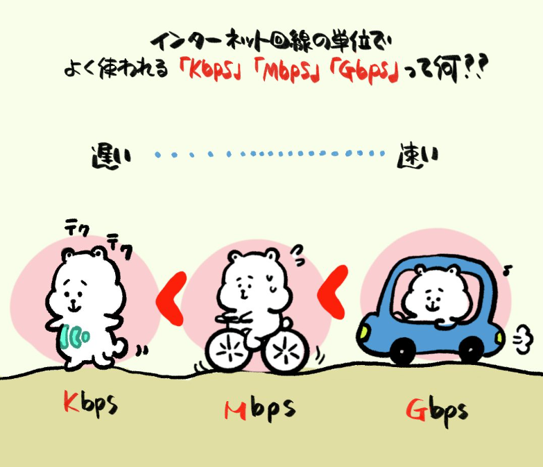 bpsとは?通信速度の目安や単位の読み方・Mbps・Gbpsとの違いを解説 2026 4/14 PR Wi-Fi 2026年4月14日 PR ホームルーターとポケット型WiFiを14日間550円でお試し!ホームルーターとポケット型WiFiが2つ同時に14日間550円で試せちゃう!4月は16セット限定(残り5セット)14日間550円「ゴールデンウィークの旅行先で!」「ご実家の帰省の際に少し」って思っている方必見!なんと550円でWiMAXのポケット型WiFiとホームルーターを14日間だけ両方同時に「お試しレンタル」できちゃう!もちろん気に入れば、そのまま契約しなおしでもOK!4月16セット限定!早い者勝ちです。詳細はこちら申込みはこちら \ワンコイン550円!/ホームルーターとポケット型Wi-Fiを14日間お試しできる! 「回線速度が遅い」「動画が止まる」 そんなときに目にするのが、通信速度の単位である「bps(ビーピーエス)」です。 ただ、bpsだけ見ても「Mbps?Gbps?結局どれくらいあれば快適?」と迷いやすいですよね。 本記事では、bpsの意味を整理しつつ「快適に使える速度の目安」をわかりやすく解説します。 さらに、いまの速度を測る方法と、遅いときに試せる改善策も紹介するので、ぜひご覧ください。 目次通信速度の単位「bps」とは?読み方と意味を解説 bps(読み方:ビーピーエス)とは、通信速度を表す単位で「bit per second」の略称です。1秒間に送受信できるビット数を表しており、数字が大きいほど通信速度は速くなります。 ビット(bit)はコンピューターが扱うデータの最小単位で、ビットが集まることで文字や画像などのデータがスマホやパソコンで表示されます。 なお、データ量の単位としてよく使われる「バイト(Byte)」との関係は、1bit=0.125Byteです。たとえば1文字は8bit(=1Byte)で構成されているため、1文字を1秒間で送信するには最低でも8bpsの通信速度が必要になります。 Kbps・Mbps・Gbpsとの違いは? Kbps・Mbps・Gbpsはいずれも「1秒間に送受信できるビット数」を表す点はbpsと同じですが、その大きさが異なります。 単位bpsとの比較主な用途Kbps(キロビーピーエス)1bpsの1000倍速い通信制限中の速度表示Mbps(メガビーピーエス)1bpsの100万倍速いスマホ・格安SIMの通信速度Gbps(ギガビーピーエス)1bpsの10億倍速い光回線の通信速度 通信速度は大きいほど快適で、同じ時間でより多くのデータを送受信できます。 日常的によく目にするのはMbpsで、光回線など超高速の回線ではGbpsが使われます。Kbpsはスマホが速度制限にかかったときに表示されることが多いです。 通信速度の単位はがbpsやKbpsよりも、MbpsやGbpsのほうが、短時間でデータをダウンロードでき、ストリーミング再生が止まりにくくなります。 通信速度は速ければ速いほど、インターネットは快適になると覚えておきましょう。 インターネットが快適に使える通信速度=bpsの目安 インターネットが快適に使える通信速度は、何をするかによって異なります。インターネットを快適に使用できる通信速度の目安を順番に解説します。 メールやLINEなどのテキストの送受信 LINEやメール、Twitterの投稿などに必要な回線速度の目安は128Kbps~1Mbps程度です。 1文字は8bitで構成されているため、文字数×8bpsが必要です。通信速度1Mbps=1,000,000bpsなので、計算上では1秒間に125,000文字を送受信できます。 つまり、通信速度が1Mbpsもあれば、スムーズにメッセージのやり取りが可能です。 SNSで写真や動画などのファイルの送受信 SNSで写真を投稿するなら3Mbps、動画を投稿するなら10Mbps以上は必要です。 ただし、写真の解像度が高かったり、動画の時間が長かったりするとファイルサイズが増えるので、さらに時間がかかります。 そのため、スマホから写真や動画をアップロード、ダウンロードする場合はWiFiに接続して行うと良いでしょう。 YouTubeやNetflixなどの動画視聴 YouTubeやNetflixなどの動画サイトではストリーミング再生が可能です。ストリーミング再生とは、インターネットに接続して、動画をダウンロードしながら再生する方法になります。 次の表は、YouTubeとNetflixで推奨される通信速度の目安です。 動画サービス画質通信速度の目安YouTube*14K20MbpsHD 1080P5MbpsHD 720P2.5MbpsSD 480P1.1MbpsSD 360P0.7MbpsNetflix*24K/UHD 4K (UHD)15Mbps高画質 (HD)3Mbps~5Mbps標準画質 (SD)1Mbps *1 出典:システム要件 – YouTubeヘルプ*2 出典:推奨されるインターネット接続速度|Netflix 通信速度が遅いと、再生が止まってしまう、画質が下がってしまうなどがあるので、表の目安以上の通信速度が維持できるようにしましょう。 LINEのインターネット回線を利用したオンライン通話 LINEではインターネット回線を利用した音声通話やビデオ通話があります。通信速度が速いほど、声が聞こえやすい、映像が滑らかになるなど、音声通話やビデオ通話の品質が良くなります。 次の表はLINEのオンライン通話に必要な通信速度の目安をまとめたものです。 オンライン通話の種類通話に必要な通信速度の目安1分間の通信量音声通話(1:1/複数人/グループ)20Kbps~26Kbps144KB~288KBビデオ通話(1:1)120Kbps~426Kbps1.6MB~30.2MBビデオ通話(複数人/グル
