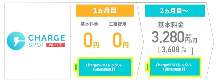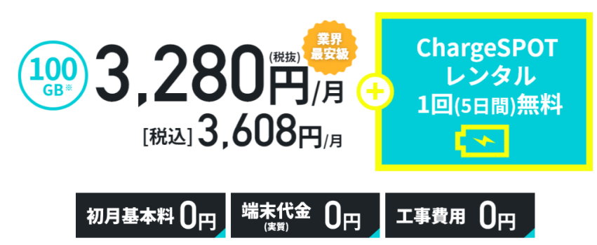 チャージスポットWi-Fiの評判は?特徴や料金プランについても解説 2025 10/03 PR Wi-Fi ポケット型WiFi 2025年10月3日 PR ホームルーターとポケット型WiFiを14日間550円でお試し!ホームルーターとポケット型WiFiが2つ同時に14日間550円で試せちゃう!4月は16セット限定(残り5セット)14日間550円「ゴールデンウィークの旅行先で!」「ご実家の帰省の際に少し」って思っている方必見!なんと550円でWiMAXのポケット型WiFiとホームルーターを14日間だけ両方同時に「お試しレンタル」できちゃう!もちろん気に入れば、そのまま契約しなおしでもOK!4月16セット限定!早い者勝ちです。詳細はこちら申込みはこちら レンタルできるモバイルバッテリーで一躍その名を広めたChargeSPOTが、ポケット型Wi-Fiも提供していることはご存知でしょうか。 その名も『ChargeSPOT Wi-Fi(チャージスポットWi-Fi)』。 本記事では、チャージスポットWi-Fiの特徴や料金について、徹底的に解説していきます。 目次ChargeSPOT Wi-Fi(チャージスポットWi-Fi)はポケット型WiFi 『ChargeSPOT Wi-Fi』はポケット型WiFiと呼ばれる「持ち運びできるWiFiルーター」の1種です。まずはポケット型WiFiのメリットを説明します。 ポケット型WiFiのメリット 回線工事が不要ですぐに使える 持ち運びできるができる 光回線より安くコスパが良い 回線工事が不要ですぐに使える ポケット型WiFiの大きなメリットは「工事不要」です。 光回線のように回線工事の必要がありません。光回線を利用するためには、インターネットに接続するための工事が必要で、専門の業者に依頼する必要があります。 また、工事自体も1日~2日かけて実施されることが多い上、予約制で数ヶ月待つ可能性もあり、時間的な制約が大きいのが特徴です。さらに工事費用が2〜3万円程度かかるのもデメリットとなります。 一方、ポケット型WiFiは工事する必要がなく、手元に届いたらすぐに使うことができます。 光回線のように工事の必要がないため、工事費用の負担もありません。また、場合によってはポケット型WiFi端末を無料でもらえるケースもありますので、実質の初期費用はゼロで開始することも可能です。 持ち運びができる ポケット型WiFiは、その名の通りポケット型のため、自由に持ち運ぶ事ができます。ですので、自宅だけでなく外出先でもインターネット接続が可能です。 ただし、エリアによっては速度に違いがあるため、快適に使える場合もあれば、少し遅いなと感じる場合もあるかと思います。とはいえ、いつでもどこでもインターネットが利用できることは大変便利です。 ポケット型WiFiが1台あれば、旅行先や移動中でも、タブレット・パソコンに繋げて、SNSや動画を楽しむこともできるようになります。 光回線より安くコスパが良い 光回線は、工事をして直接回線をつなぐため、速度が安定しています。そして、料金もポケット型WiFiよりも高いという一面があります。 一方、ポケット型WiFiの月額料金は、光回線の月額料金よりも安く設定されているケースが多いため、コスパ的にはとても魅力です。 いつでもどこでもネットに繋げて動画やSNS を楽しむならポケット型WiFiはおすすめです。 ポケット型WiFiが向いている人 家でも外でもパソコン作業をする人 出張が多い人 配線をすっきりさせたい人 軽くて持ち運びが楽なものがよい人 家でも外でもパソコン作業をする人 自宅だけでなく、外出先でもパソコン作業をする人は、持ち運び便利なポケット型WiFiがおすすめです。固定回線やホームルーターでは、自宅だけでの使用に限られますが、ポケット型WiFiなら外出先でもネットに接続できます。 出張が多い人 仕事で出張が多い人にもお勧めです。移動中の新幹線や、宿泊先でのホテルなどに持っていけるので、そのような場所でもネットに接続して仕事をする事ができ大変便利です。 配線をすっきりさせたい人 ポケット型WiFiは配線が必要ありませんので、部屋の中をすっきりさせる事ができます。配線を引くのを好まない方にもポケット型WiFiはおすすめです。 軽くて持ち運びが楽なものがよい人 ポケット型WiFiはスマホサイズくらいですので、持ち運びもとても楽です。軽くて持ち運びが楽なものが良い人にもポケット型WiFiはおすすめです。 チャージスポットWi-Fi公式サイトはこちら ChargeSPOT Wi-Fi(チャージスポットWi-Fi)の特徴 参照元:【公式】CHARGESPOT Wi-Fi ここからはChargeSPOT Wi-Fiの特徴について説明します。以下の3つが大きな特徴です。 レンタル充電サービスが月1回無料 月間100GBまで使用できる 安定した速度 レンタル充電サービスが月1回無料 参照元:【公式】CHARGESPOT Wi-Fi ChargeSPOT Wi-Fiの特徴の1つ目は、チャージスポットという充電サービスを1ヶ月に1回(5日間)無料で利用できることです。このチャージスポットはここ数年で設置個所が増えており、ショッピングセンターなど全国30,000箇所以上に設置されています。 (2021年12月時点 ※INFORICH調べ。参照元:https://media.chargespot.jp/) 本来、チャージスポットは、5日間使用すると