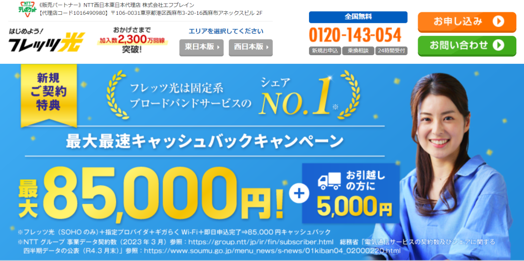 内容:指定ページからの申し込み・開通でキャッシュバック(戸建て:85,000円、マンション55,000円)