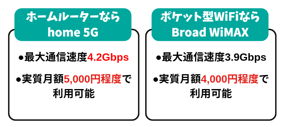 紹介したサービス中で、通信速度の速さで1番おすすめの自宅用工事不要WiFi(ホームルーター)はhome 5G、通信速度の速さで1番おすすめの持ち運び工事不要WiFi(ポケット型WiFi)はBroad WiMAXです。