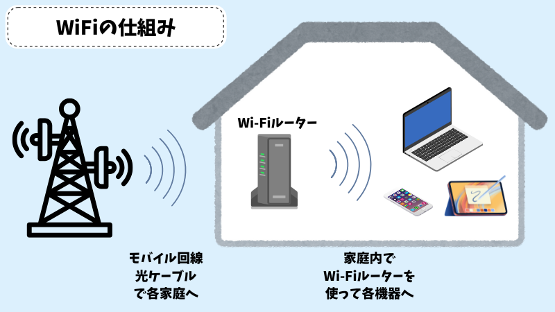 WiFiも同じで、ルーター(WiFi機器)から電波を受信してインターネットが使えるようになります。