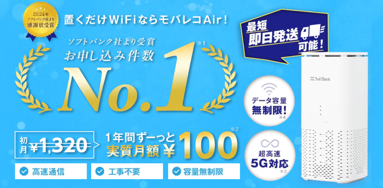 | SoftBank Air | 4,950円 | 事務手数料:3,850円 端末代金:実質無料 | 4,276円 | ・SoftBank Air ハッピープライスキャンペーン ・あんしん乗り換えキャンペーン |